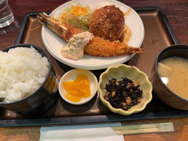 まずは難波駅近くの佐海屋へ……。店の場所が移転して店を探すのに一苦労……。大エビフライとコロッケ定食です。美味!